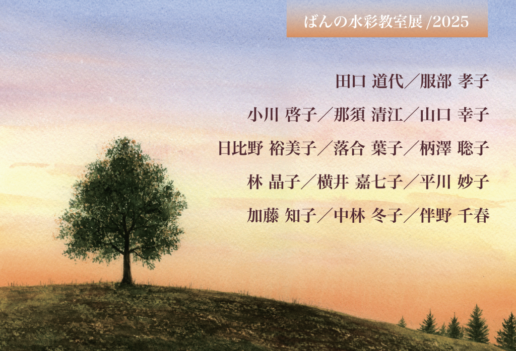 2025年11月18日〜30日 『ばんの水彩教室展/2025』【陶ふ工房】 投稿日: 2025年11月16日2025年11月16日by 伴野重由 期間:2025年11月18日(火)〜30日(日) 営業時間:10時(18日/12時開場)〜18時30分(最終日12時まで) 開催場所:とうふ処ギャラリー 陶ふ工房 住所:愛知県春日井市坂下町2丁目505-1 TEL:0568-88-0087
